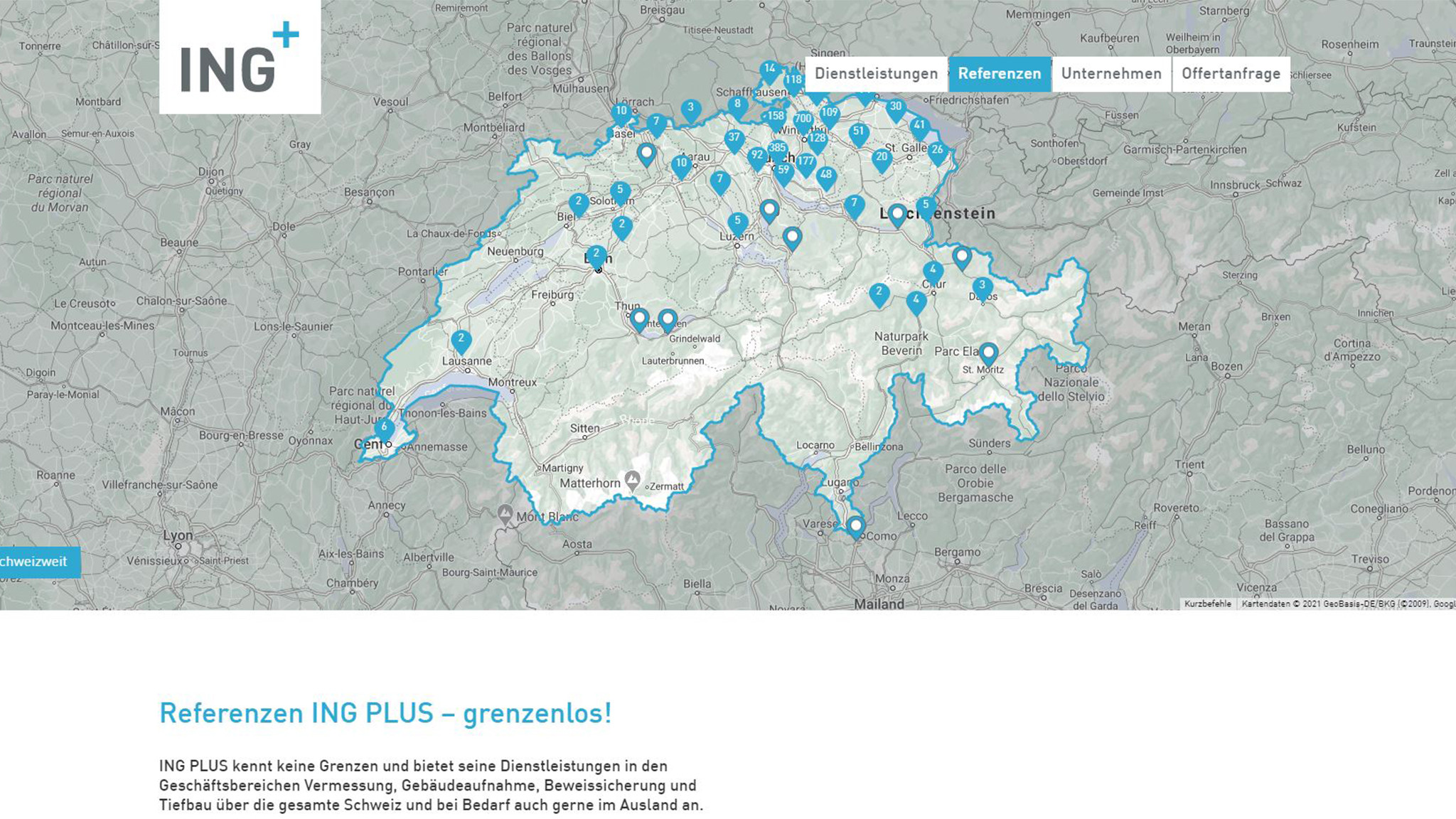 Als innovatives Ingenieur- und Vermessungsunternehmen kennt ING PLUS keine Grenzen und bietet seine Dienstleistungen in den Geschäftsbereichen Vermessung, Gebäudeaufnahme, Beweissicherung und Tiefbau über die gesamte Schweiz und bei Bedarf auch im Ausland an. Nirgends wird das deutlicher als auf der Referenzkarte von ING PLUS. Sie zeigt eindrücklich den regionalen, nationalen und internationalen Fussabdruck realisierter Projekte.