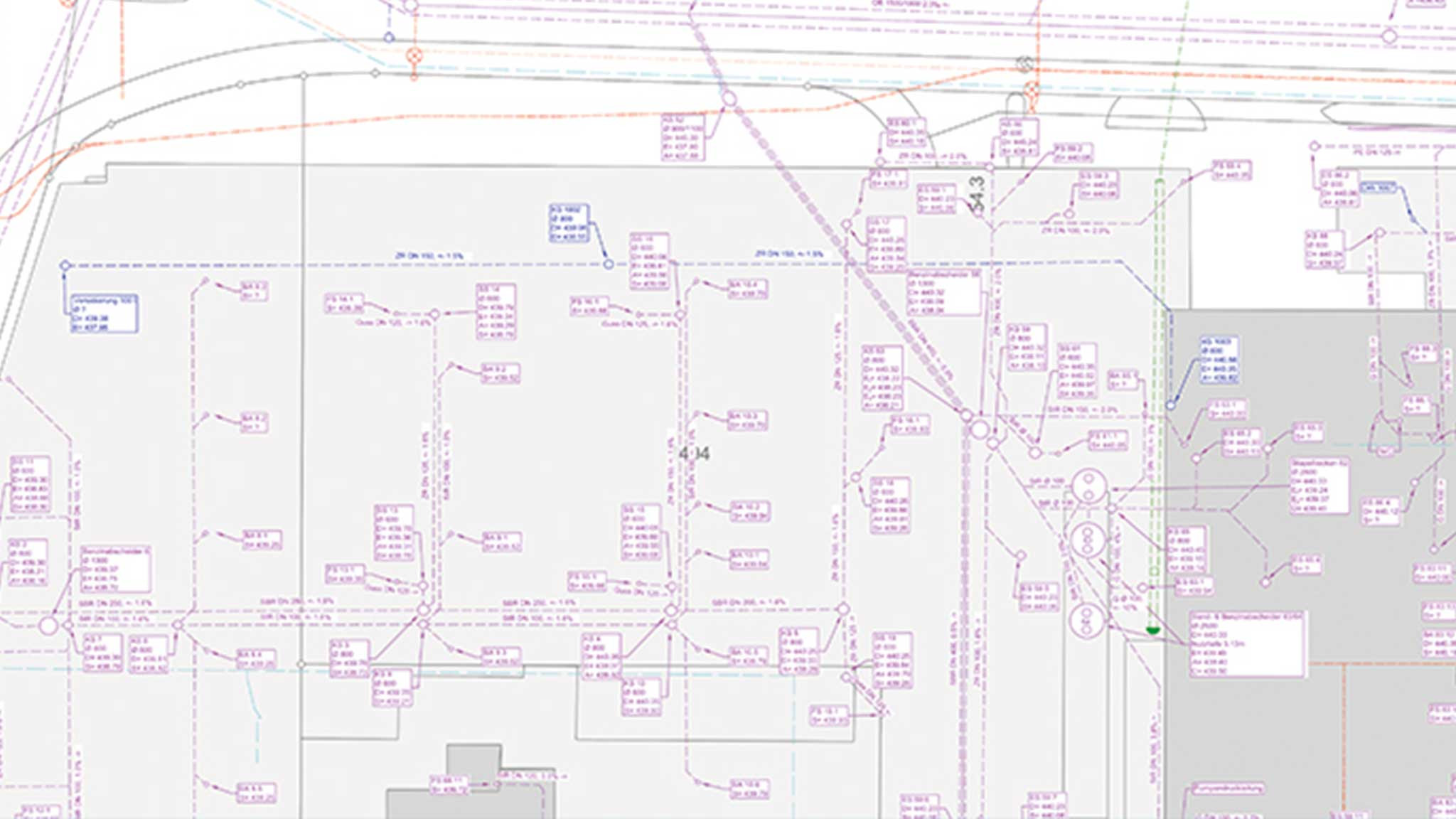 Im Werkplan sind sämtliche Grundleitungen ab den Fallsträngen bzw. unter der Bodenplatte bis zum Anschluss an die öffentliche Kanalisation ersichtlich. Als Grundlage für die Kanal TV-Aufnahmen und Vermessungsarbeiten hat ING PLUS zunächst die vorhandenen Bestandespläne ab PDF bzw. Plan digitalisiert. Nach Abschluss der TV-Aufnahmen und den Vermessungsarbeiten, der georeferenzierten Aufnahme der Schächte, wurden die schadhaften Stellen von ING PLUS punktgenau in den Werkplan übertragen.